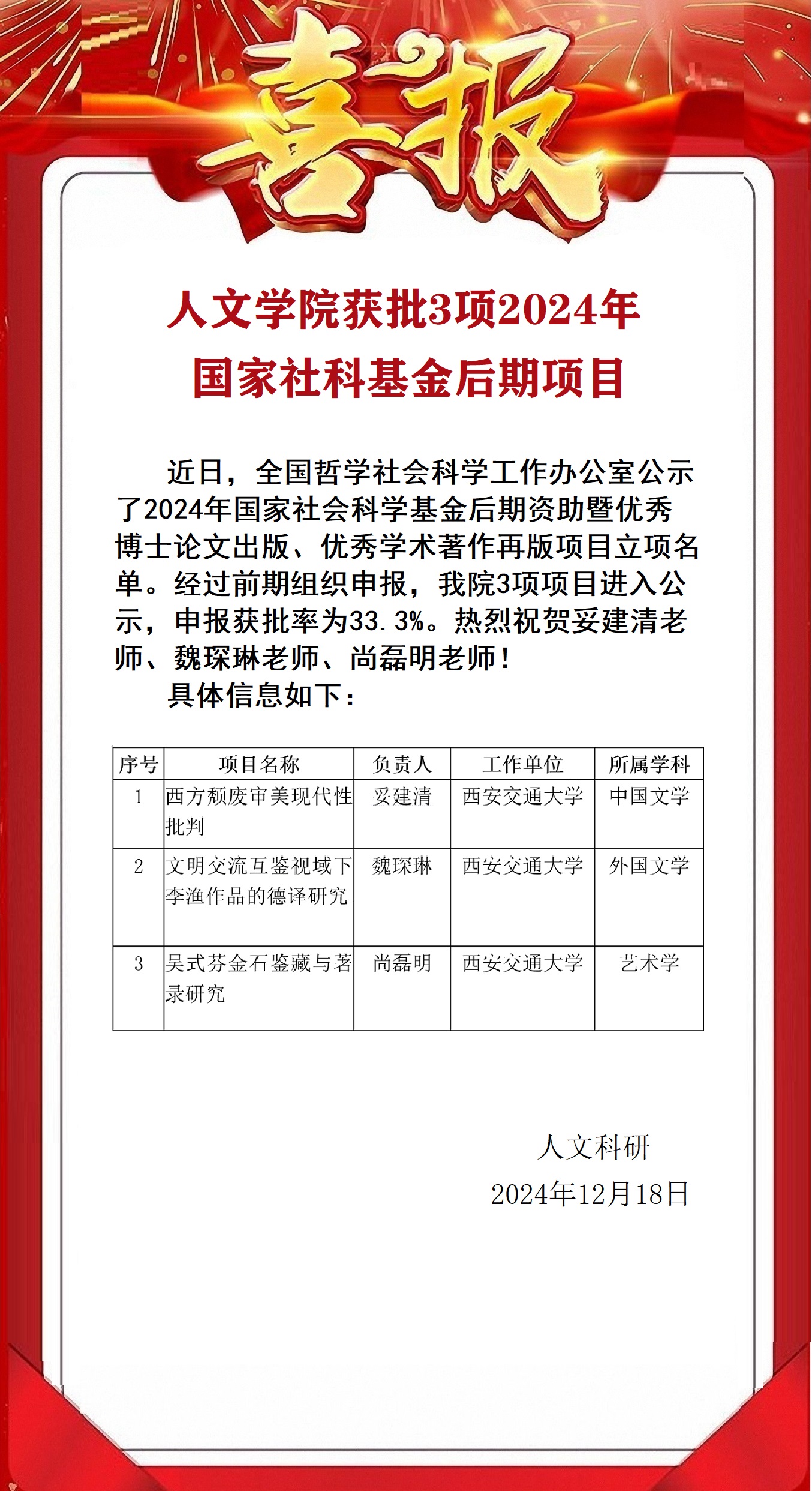 【喜报】大陆娱乐城 获批3项2024年国家社科基金后期项目