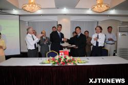 签约仪式后,程光旭副校长与萨斯喀彻温大学副总教务长Ernie Barber代表双方交换礼物并合影留念。