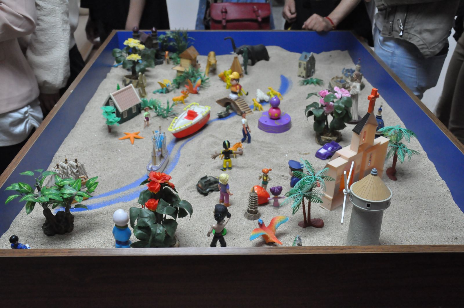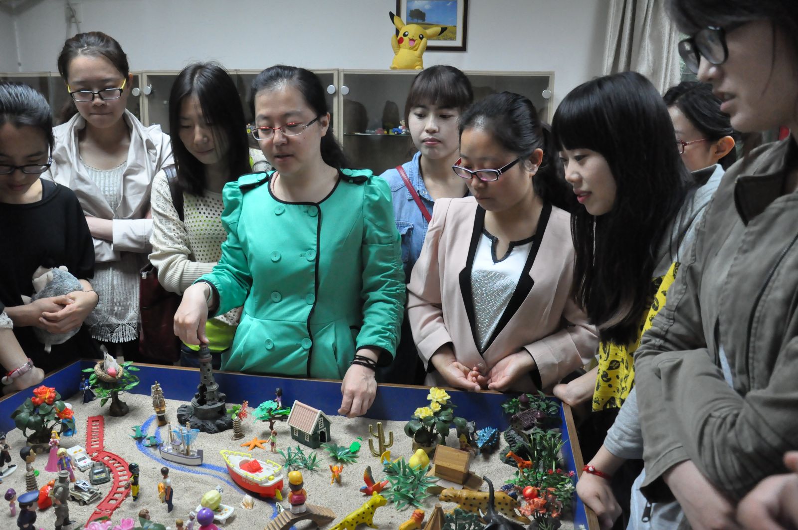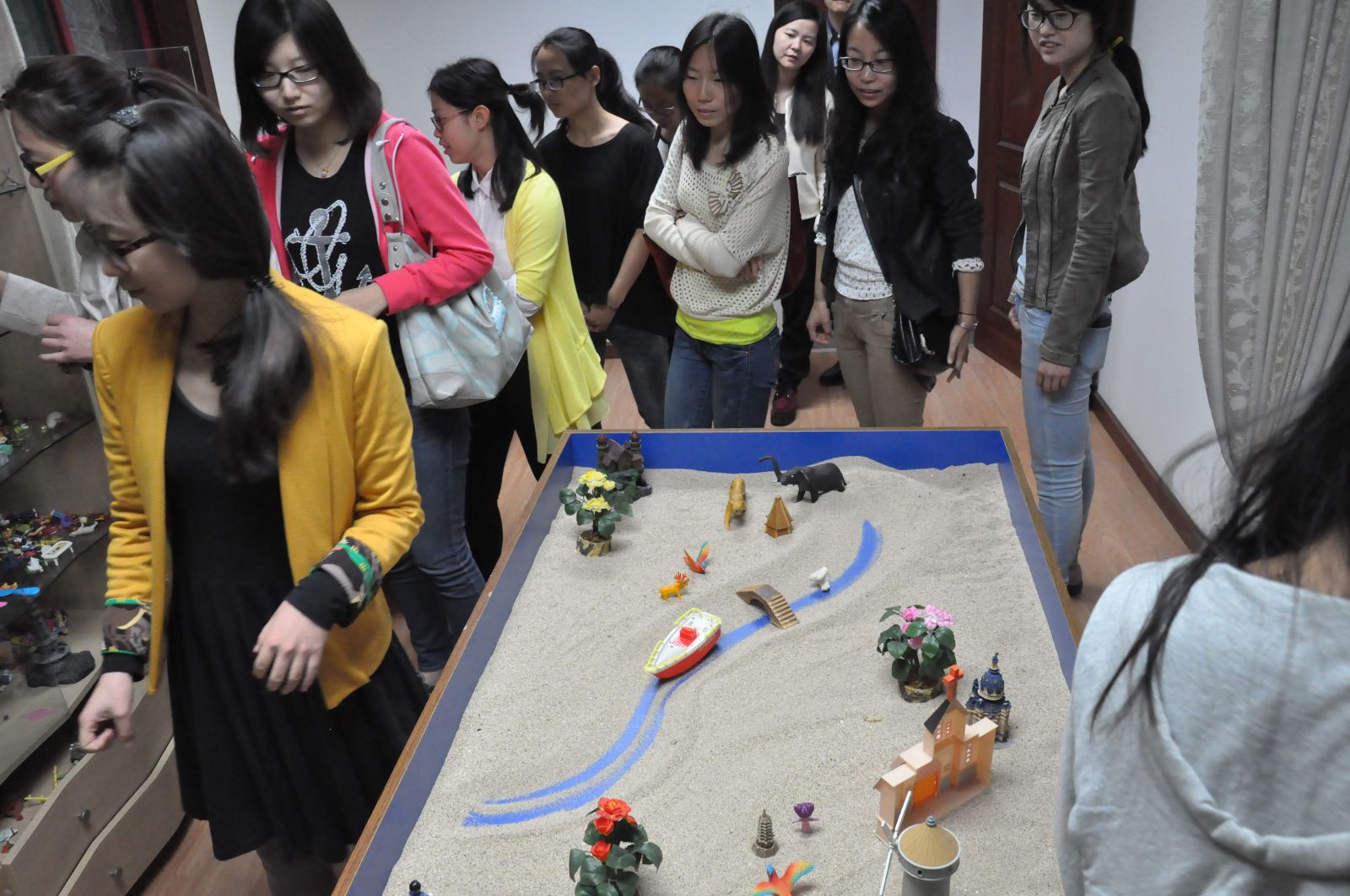 此外,为了解参与此次活动的13位学生的心理特质,闫琼老师还和同学们在沙盘室里进行了沙盘游戏。这是来访者从玩具架上自由挑选玩具,在盛有细沙的特制箱子里进行自我表现的一种心理疗法,能够较准确地反应出来访者的个人性格以及内心倾向。13名学生在闫琼老师的指导下,都饶有兴致地选取自己喜欢的物件摆放在沙盘上,直到最后空荡荡的沙盘变得满满当当。摆放完毕后,闫琼老师根据每个人摆放的具体物件的类型和位置,帮助每一位同学认真细致地分析了他们的心理状况,并提出了中肯的建议。