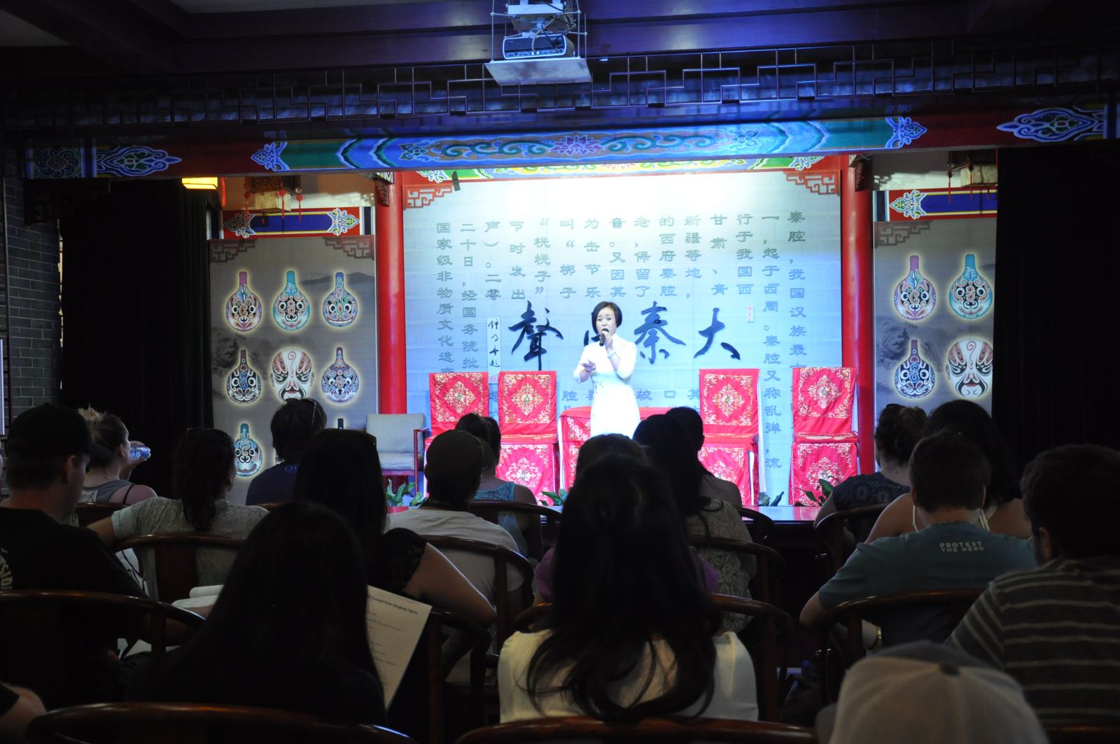 书法观摩结束后,代表团一行参观了陕西秦腔博物馆。陕西秦腔博物馆梅花奖得主李淑芳老师先对秦腔艺术做了简短的介绍。随后,李淑芳老师及2名国家一级演员上台为师生们表演了三段著名秦腔选段。原住民学生们聆听着秦腔艺术,听的是津津有味流连忘返。