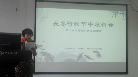 中文系李慧教授致欢迎词,她提到:“今年是农历丙申年,于西安交通大学而言具有非凡的意义,交大在今年迎来了她的第120周年,自此交大将开始新的征程。那么本次长安诗歌节选在西安交通大学举行,更是多了一层韵味。因为西安交通大学位于唐明皇行宫对面,此地自古以来就是文人爱好者的聚集之地,我想今天我们在这里举行中秋诗会,定能碰撞出不一样的火花!我也希望通过这次活动能够唤起我们的学生、呼唤我们的年轻人拿起笔,回归诗意的栖居。”
