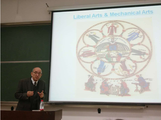 11月8号10:00,在主楼B座102教室,Marijuan教授进行了题为《历史视野中的知识重组》的公开讲座。讲座以西方科学史为线索,分别讲述了人类知识在古代、欧洲中世纪、启蒙运动时期、后工业革命时期以及信息革命时期所呈现出的不同形态与历史环境的相互关系,以及不同时期知识形态之间更迭的规则与过程。