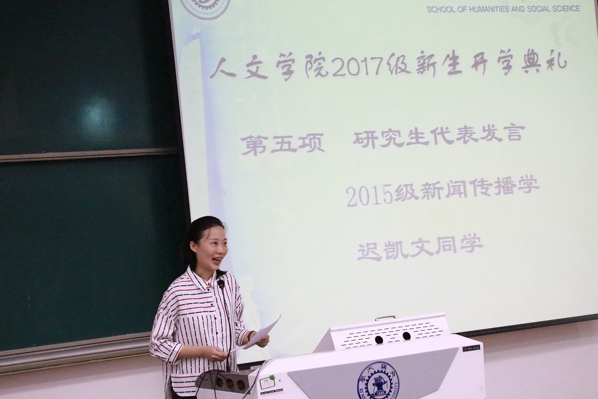 2015级新闻传播学硕士研究生代表迟凯文用娓娓道来的话语鼓励同学们要遵照校训,“精勤求学,敦笃励志,果毅力行,忠恕任事”。本科新生们要学会独立生活,要勇于承担责任。研究生新生们要不惧坎坷,努力科研。交大治学严谨,舞台广阔,机会众多,同学们要抓住机会,提升自我,释放青春能量。
