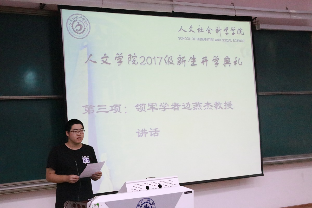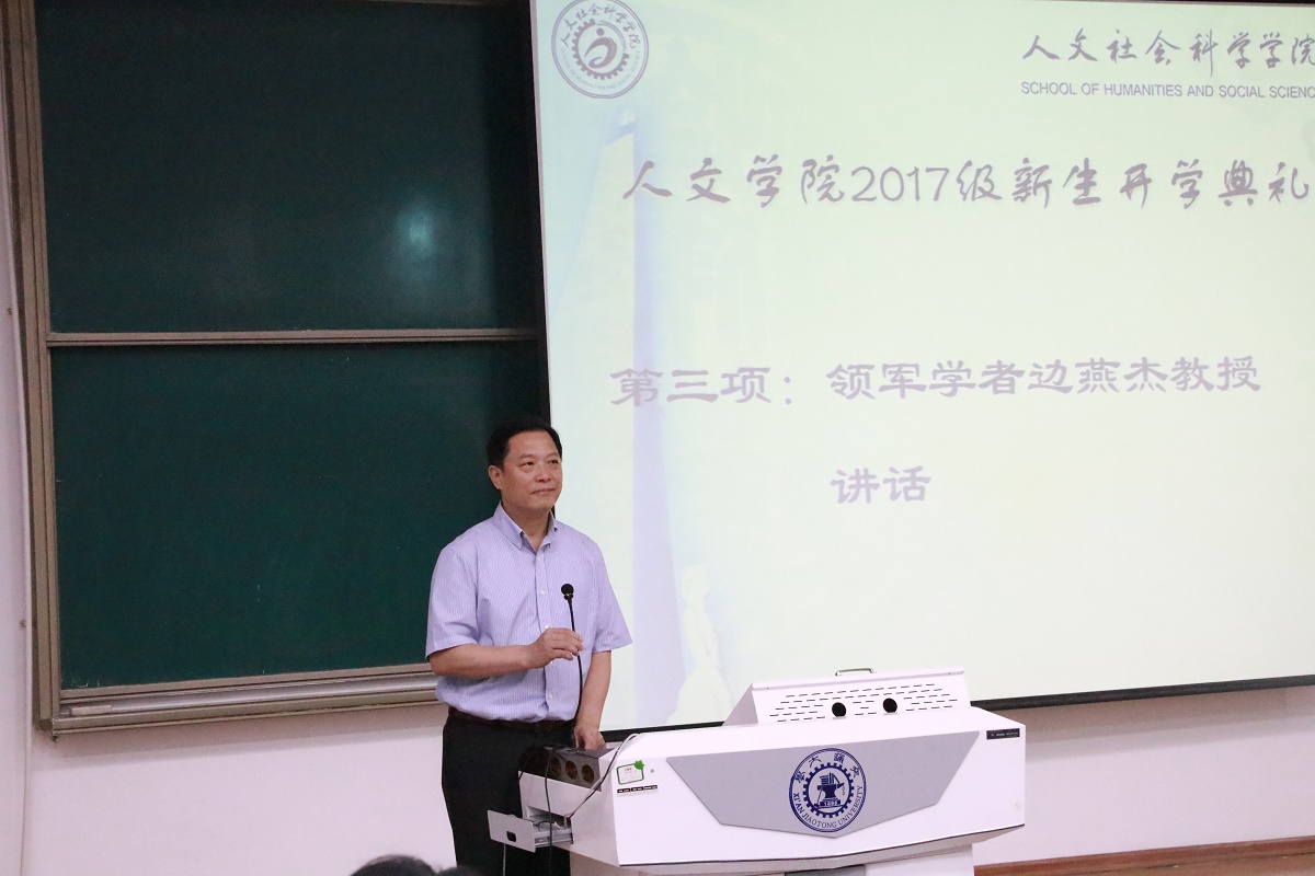 教师代表边燕杰教授对同学们加入人文大家庭表示热烈欢迎。边教授通过讲述自己学生的真实经历告诉同学们坚持梦想的可贵性和重要性。边教授教导大家要执着学术,一丝不苟,为梦想和目标而坚持奋斗。不论客观环境多么艰辛,同学们都不能忘记学术初衷。