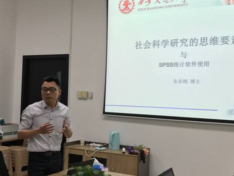 随后,朱老师结合具体的案例和数据系统讲解了社会科学实证研究中的若干重要问题,涉及理论、概念、变量和假设等。朱老师强调,对于理论的把握可以从多个层面进行,理论从本质上来看是由若干概念组成的有机系统,是概念的系统化;变量则是概念的操作化,概念转化成实际可操作的变量是至关重要的环节。需要特别注意的是,在具体测量变量时,应尽量参考已有的成果。最后,朱老师结合具体数据为在座师生演示了SPSS的操作界面与具体功能,包括描述分析、探索性因子分析和信度检验等等。