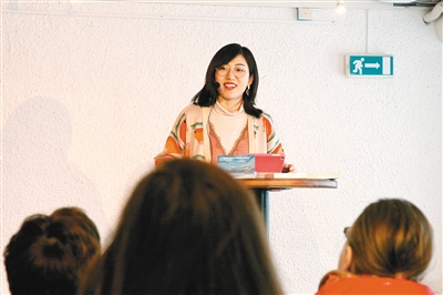 2月15日,在挪威北极小镇希尔克内斯,中国科幻作家夏笳在图书馆里用英文为读者朗诵。 (新华社 记者 梁有昶 摄)