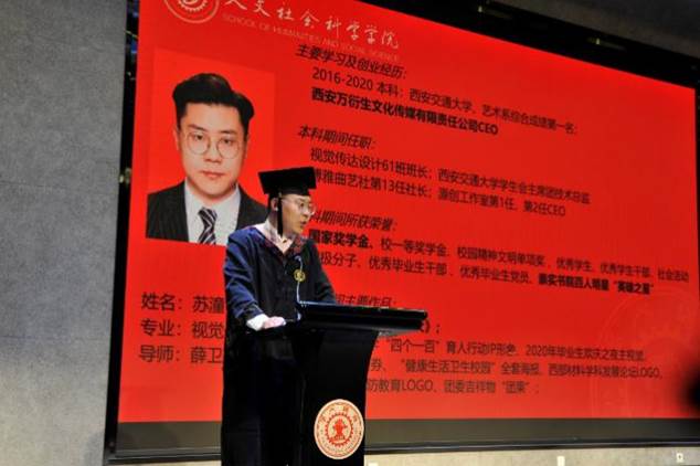 毕业典礼上,苏潼同学代表全体本科毕业生发言。他说到,交大校园让他感受到尊重、包容、踏实和自由,交大人特有的宝贵精神财富让他无惧困难勇往直前,学院和书院的老师们让他人格充盈、专业过硬、富有力量。成长在交大,一路走来,哪怕各种坎坷,各种不顺和阻碍,终能看到花团锦簇、灯彩佳话。