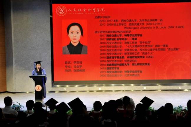 李吉悦同学作为研究生毕业生代表发言。她提到,如何在不安、忐忑和焦虑中拥抱生活的不确定性,唯有理想和担当。理想是坚定不移地去寻找她所热爱的、能为之不断奋斗的事业,在广袤天地中提高能力、开拓眼界。担当是践行西迁精神,以专业使命和社会责任要求自己,凝聚起交大人的“命运共同体”。毕业之际,她勉励同学们扛起背包再出发,到祖国最需要的地方建功立业。
