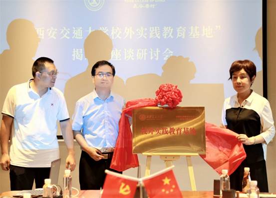 在唐村乡创议事厅,与会人员进行了座谈。长安唐村项目副总经理魏行行向来宾简要介绍了天朗集团及其相关项目的发展情况。活动现场,徐亮副主任、张顺副院长与孙茵董事长共同为西安交大“校外实践教育基地”揭牌。