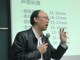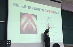 陈阳静医生从人类的进化,讲到喉部的精细结构,以及嗓音和听觉器官的关系,阐述了医学科学研究上的成果。为了让学生们有直观的了解,在课堂上他用不同的图片和视频,展示了喉部的构造,以及用喉镜所观测到的声带在发声、说话以及歌唱时候的状态;强调了在歌唱中气息的重要性,说明歌唱时腹式呼吸的科学性,其实也是保护声带的最好的方法,并解释了如果没有科学发声方法可能会导致疾病的成因,同时用视频展示了疾病发生时的声带以及喉部的状态。此外,陈阳静医生也通过男女声带长度的生理差异,解析了为什么歌唱会分为男低音、男中音、男高音、女中音、女高音等方面的科学知识,以医学的观点解析了音乐艺术的内在规律。