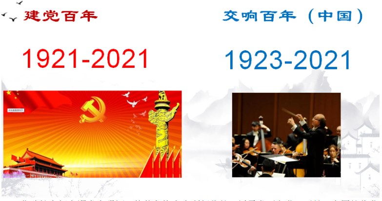 “今年是中国共产党建党百年,举国上下共庆党之百岁华诞,而中国特色的交响音乐也走过了近百年的创作历程,作曲家们用交响音乐见证不同时期的沧桑历程。”曹耿献副教授首先介绍了建党百年与中国特色交响音乐的联系,“从建国之前的革命斗志到新时代的华章奏响,中国的交响音乐也在表达着不同时代的精神实质。”