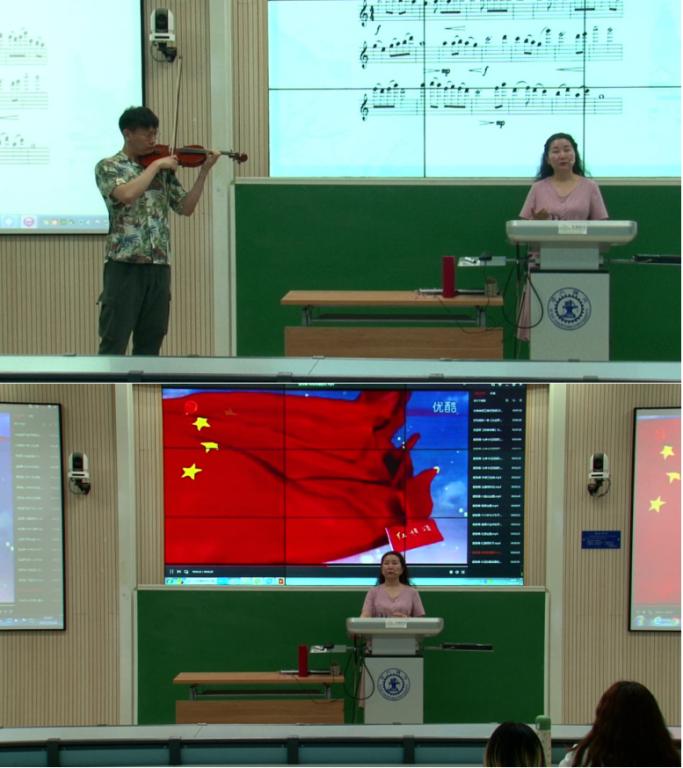 课堂上,老师和同学们一起通过一首《红旗颂》重温开国大典上五星红旗冉冉升起时激动人心的时刻。本课程的选课学生杨峥同学,现场用小提琴再现了温暖优美的“红旗主题”,通过曹耿献老师的讲解和分析,大家了解到了这部作品所蕴含的“中西融合的创作思维”。