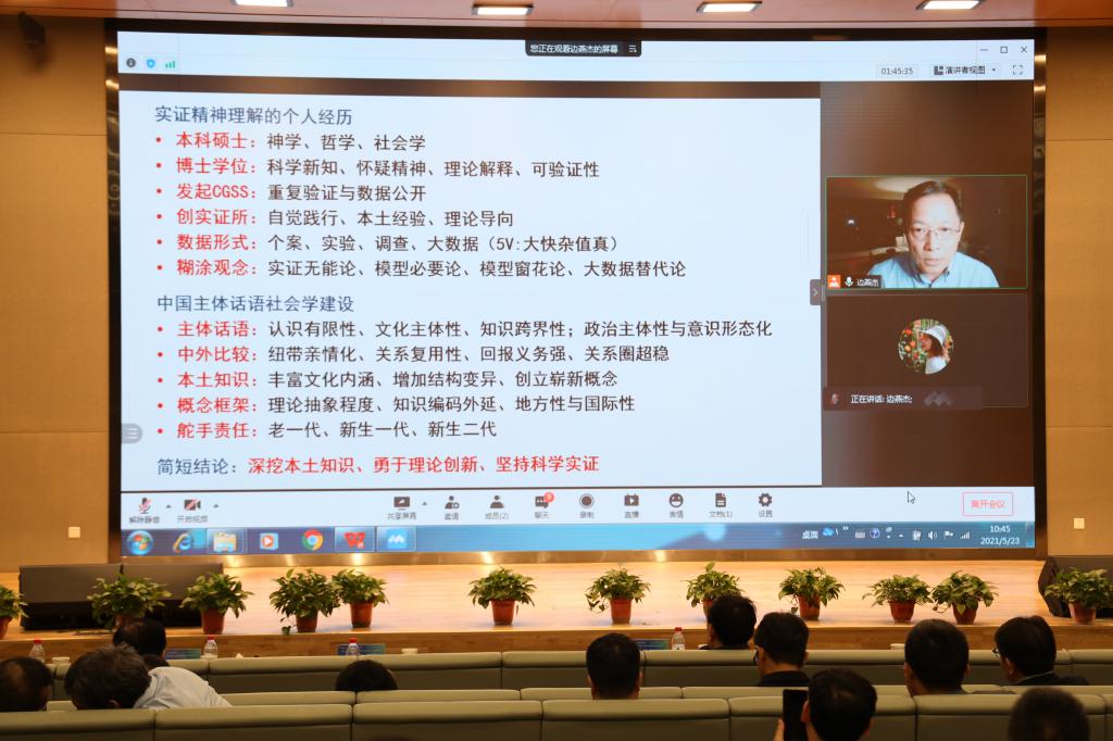 西安交通大学教授边燕杰通过线上方式作题为“科学实证精神与中国主体话语社会学建设”的主题报告。他提出,要深挖本土知识,勇于理论创新,坚持科学实证。边燕杰认为,中国学者做理论研究必须要研究中国现实问题,中国特色社会学的研究从哲学角度来讲应直接成为中国主体性研究,在提出中国主体话语时,应基于人认识的有限性,利用本土知识去进行概念建构,并且让知识理论跨界,坚持地方性和国际性的结合。