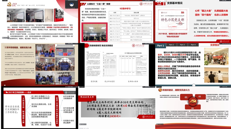 硕1104和1105党支部书记王彦清介绍了支部在2021年进行的各项党团活动,对支部存在的诸如与群众联系不够紧密等不足进行了反思,并对后续将实施的工作进行规划。硕1103和1106党支部开展了丰富多彩的支部活动,该支部发扬了同学们的学科专业优势,将理论学习与艺术活动相结合。疫情期间,支部党员积极投入到志愿服务活动中,并响应西安交通大学团委的号召录制抗疫加油视频,获得“十佳”荣誉。