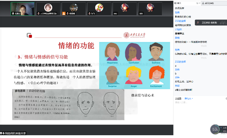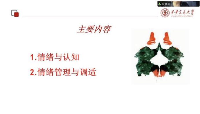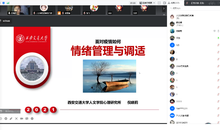 当前,西安处于疫情防控的重要时期,面对疫情带来的变化,师生难免在心态和情绪上出现问题。倪晓莉教授从这一背景出发,分别以情绪与认知、情绪管理与调适两个部分细致讲述了疫情期间情绪管理和调适的重要性,也用大量生动的案例传授了情绪管理和调适的积极方法,为师生疫情期间积极管理和调适情绪,以更加饱满、健康的情绪迎接工作、学习、生活提供了良好建议。