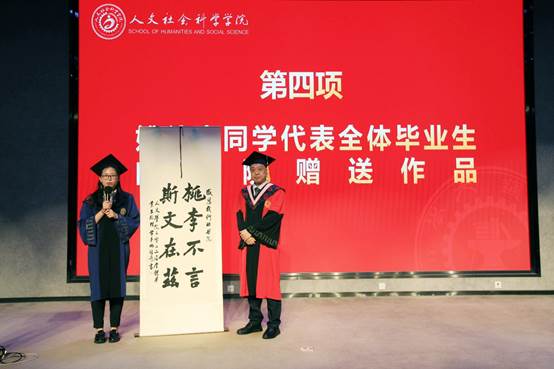 为感谢老师们的教导与学院的培养,书法专业硕士生姚佳奇同学代表全体毕业生向学院赠送了书法作品:“桃李不言,斯文在兹”,并在现场进行了阐释,表达了对学院和老师们的感激之情。
