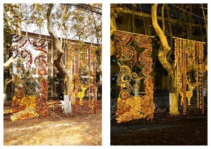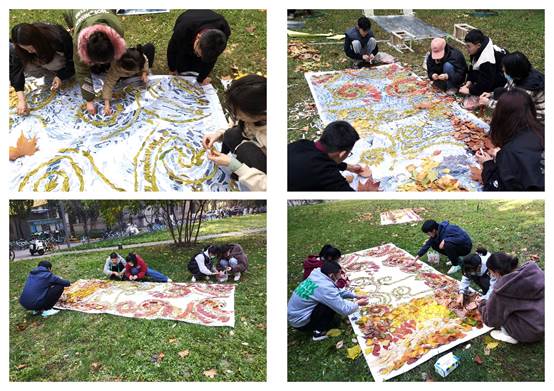 在艺术实践中,课程鼓励、开发同学们的艺术创造力。老师与助教带队在校园寻找合适的叶色、叶形,学生利用课余时间分批次制作,在欢声笑语中共度金秋快乐时光。特别是在实践过程中,学生们“因叶、因色、因地制宜”,不断提出新的创意,大胆地进行二次艺术创作,为作品增加了不少趣味和互动氛围。因秋叶颜色存续时间短,师生抓紧时间制作,现场解决安装难题,历时3天终于完成了全部艺术实践。
