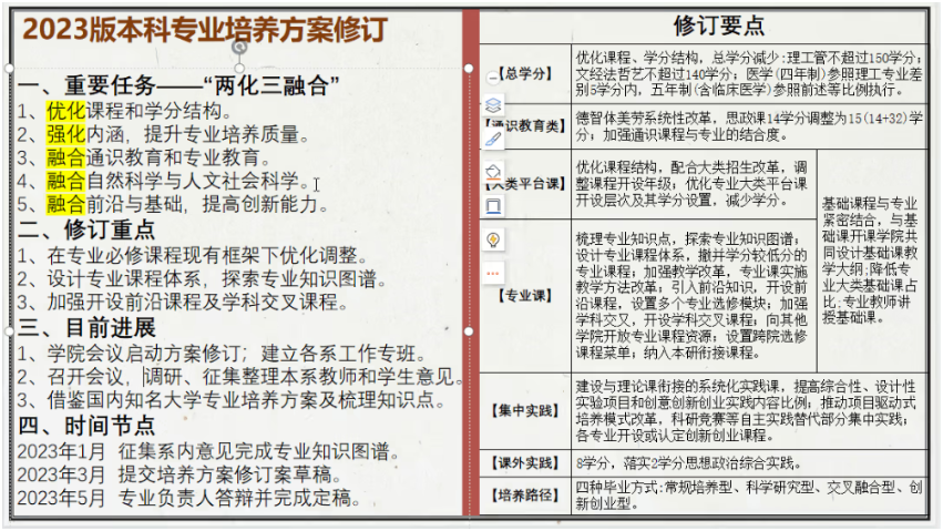 2023版本科培养方案修订工作启动会的精神,从两化三融合五个维度介绍了修订工作的重要任务,同时还对本次的修订重点和培养方案工作专班前期已经开展的相关工作和重要时间节点进行了介绍。本次修订工作的主要任务是要优化课程和学分结构,强化内涵,提升专业培养质量,融合通识教育和专业教育,融合自然科学与人文社会科学,融合前沿基础,提高创新能力。同时,修订工作的重点是要基于我们现有课程框架凝练梳理出体系化的知识图谱,同时在这一过程中加强前沿课程与学科交叉知识内容,面向新时代人才培养的新特点和新要求。此外,还应该积极探索制定学科竞赛、创新创业实践代替课外8学分的实施方案,在德智体美劳多维度提升人才培养成效,特别是在思政、美育、劳育方面要重点关注。此外熊老师还介绍了2023年本科生毕业设计(论文)流程管理上的新规定,和本科生学业导师管理办法的细节要求,指出各位老师要高度重视本科生毕业论文的指导工作,与学生积极保持联系,紧密掌握学生思想动态,完成学校交代的各项工作任务。