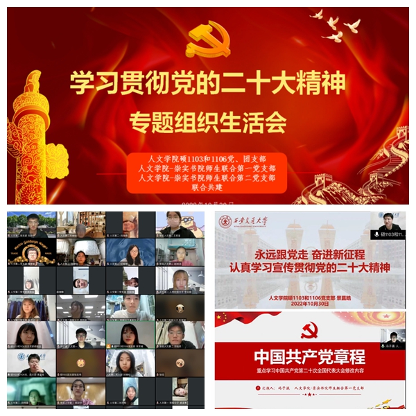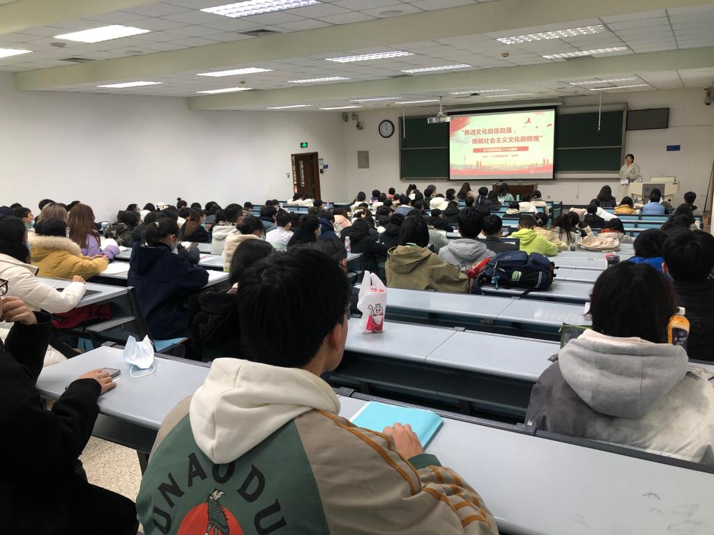 党委书记纪梦然为崇实书院入党积极分子作“推进文化自信自强,铸就社会主义文化新辉煌”主题党课。学院党委组建“人文之光”宣讲团,并选拔优秀本科生参与其中,强化对学生政治宣讲和思想引领,深入开展对党的二十大精神研究阐释和宣传宣讲工作,为本科生党支部购置发放《习近平谈治国理政》(第四卷)等学习材料,持续深化习近平新时代中国特色社会主义思想学习教育。