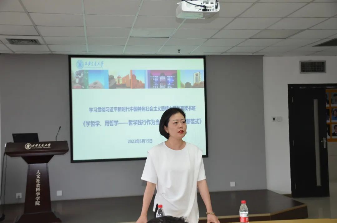 随后,哲学系副教授丁晓军以“学哲学、用哲学——哲学践行作为当代哲学研究的新范式”为题,介绍了哲学践行的新理念及其在当代哲学研究中的应用。“哲学践行作为哲学研究的新范式,不仅是在理论上深入探讨问题,更是在实践中践行哲学。”丁晓军副教授以习近平总书记在哲学社会科学工作座谈会上的讲话为出发点,阐述了哲学践行的重要性,并从哲学用途、当代哲学咨询之发展、当代哲学咨询之形成、当代哲学咨询之实践、当代哲学咨询之方法、哲学咨询之用六个方面对哲学践行这一当代哲学研究的新范式展开报告。通过多个案例讲解,丁教授生动形象地展现了哲学践行对当代社会的重要性,并鼓励大家尝试践行哲学,去解决社会中的实际问题。