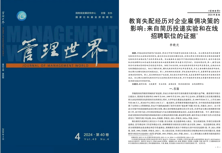 近日,西安交通大学社会学系李晓光副教授完成的研究《教育失配经历对企业雇佣决策的影响:来自简历投递实验和在线招聘职位的证据》于《管理世界》2024年第4期发表。《管理研究》是由国务院发展研究中心主办的经济管理理论刊物,2023年复合影响因子为31.204,综合影响因子为22.557,是中国人文社会科学期刊综合评价指标体系(AMI)管理学领域排名第一的顶级期刊。该研究成果获得国家自然科学基金青年项目和中国博士后科学基金特别资助项目的经费支持。
