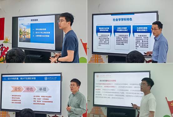 哲学系主任王嘉新、社会学系主任卢春天、艺术系骨干教师刘令贵分别从队伍建设,人才培养,科学研究等方面介绍了本学科发展的现状,分析了本学科发展的优势和短板,并对未来发展提出了目标和举措;中文系副主任刘祥,对标申报一级学科的条件,也对中文学科近几年的发展做了比较详尽的阐述。